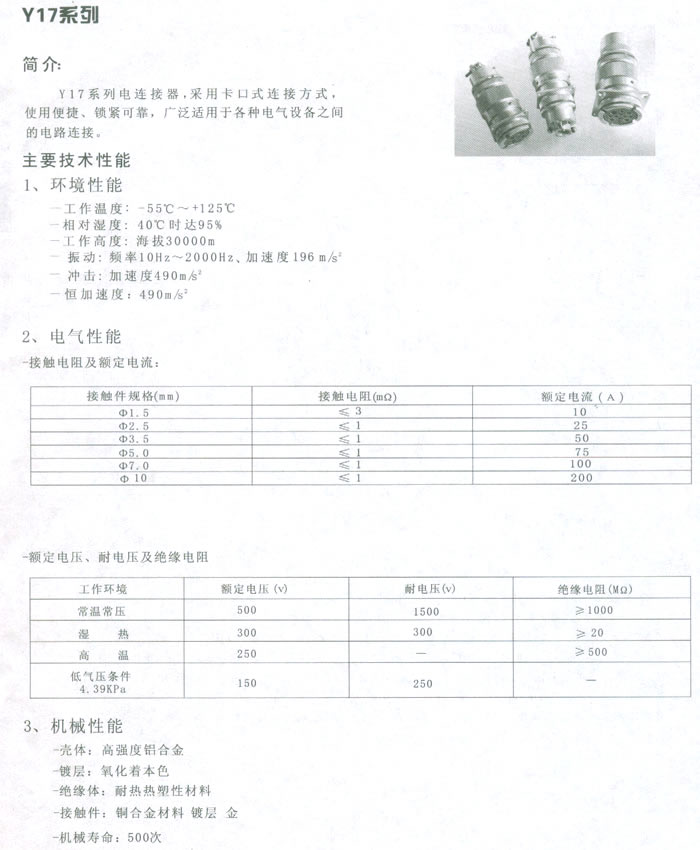 一、Y17系列圓形電連接器(航空插頭)簡介 Y17系列電連接器,采用卡口式連接方式,使用便捷,鎖緊可靠,廣泛適用于各種電氣設備之間的電路連接。 二、主要技術性能1、環境技術性能