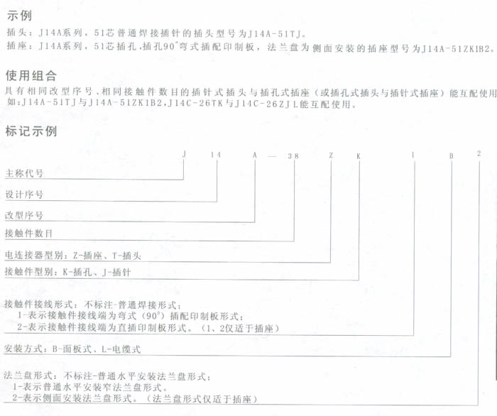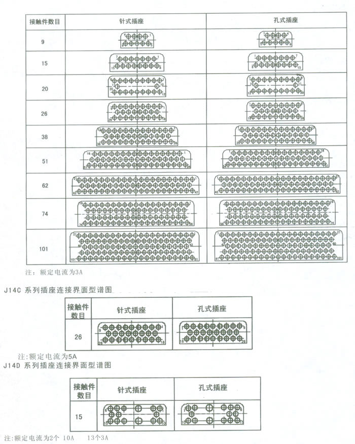 一、J14A、C、D系列矩形電連接器簡介 本系列電連接器(航空插頭)屬于低頻電連接器。雙保險鎖緊機構,是矩形電連接器中兼顧操作快捷、使用可靠的連接鎖緊形式、端接形式為焊接。該系列產品規格齊全,可分為針式、孔式插頭,針式面板式、孔式面板式插座;針式電纜式、孔式電纜式插座等多種規格。另外J14A系列插座還有直插印制板形式和90度彎插印制板形式。 二、J14系列矩形電連接器適用范圍 適用于戰略武器系統、航天衛星系統、運載火箭、地面保障系統,也可廣泛用于各種電子儀器、儀表及電纜間的連接。 三、使用環境條件 工作溫度:–55℃~+125℃ 四、主要技術性能 額定電流(A):