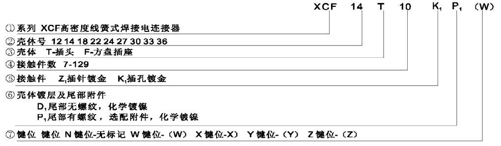 機械性能 殼體:高強度鋁合金材料 非屏蔽鍍層:陽極氧化作色 屏蔽鍍層:鍍鋅彩虹色鈍化或軍綠色鈍化、化學鍍鎳 絕緣體:熱固性材料 接觸件:銅合金材料 表面鍍金、銀 封線體和密封圈:硅橡膠材料 機械壽命:1000次 標記代號及意義 ![]() 注:1、表示整套電連接器時,標記代號采用分數形式,插座標記寫作分子,插頭標記寫作分母,中間用斜線隔開。 2、插頭、插座型號在產品上直接標出,電連接器型號供用戶訂貨和公司生產、經營管理用。 3、對于選配附件的插頭(座),可在其標記代號后加+再寫出所選附件。 例如:XCF系列14型裝鍍金插孔插座,接觸件芯數為10芯,殼體化學鍍鎳,N鍵位 型號為:XCF14F10K1P1 XCF系列14型裝鍍金插針插頭,接觸件芯數為10芯,殼體化學鍍鎳,N鍵位 型號為:XCF14T10Z1P1 整套連接器型號為:XCF14F10K1P1/P1 外形尺寸 XCF插頭 ![]()