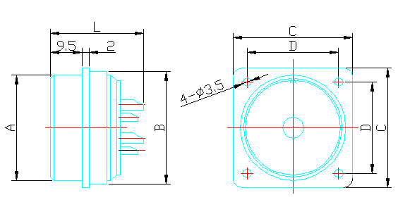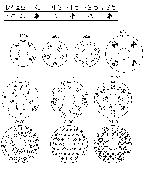 Y16-2416方形法蘭盤穿墻式插座 ![]() Y16接觸件孔位排列 ![]() 執行標準 Q/321283LSB09-2006《Y16系列螺紋式圓形電連接器詳細規范》 型號標志 Y 16 P - 24 30 Z J 10