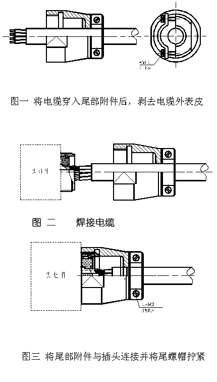 將尾部附件從插頭上擰開并將尾螺帽擰開(如圖所示)以便電纜線穿入—電纜線從尾部附件的孔中穿入—?jiǎng)兙—焊線—與插頭尾部連接—將護(hù)線套或夾線板擰緊。其主要過程與步驟用下列3個(gè)圖來表示。