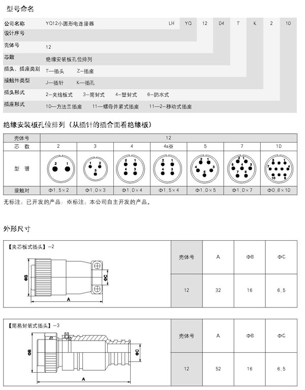 YQ12小圓形電連接器主要適用于低壓信號 連接,采用螺紋連接,插頭、插座灌膠密封,該產品具有頭座插好后防雨淋的特點。 主要技術性能 環境性能 —工作溫度:-20℃~70℃ —相對濕度:40℃時達95% 機械性能 —殼 體:銅合金、鍍鎳 —接 觸 件:銅合金、鍍金 —振動:頻率10Hz~2000 Hz加速度196m/s2 —沖擊:加速度490m/s2 —絕緣體:熱塑性材料 —機械壽命:500次 電氣性能 —接觸電阻及額定電流 電氣性能 接觸電阻及額定電流