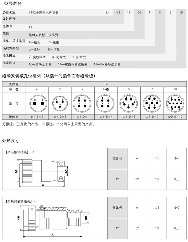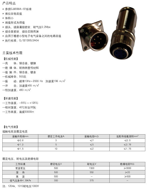 YS12小圓形電連接器主要適用于低壓信號連接,采用直插自鎖結構,插頭、插座灌膠密封,該產品具有頭座插好后防雨淋的特點。 主要技術性能 環境性能 —工作溫度:-20℃~70℃ —相對濕度:40℃時達95% 機械性能 —殼 體:銅合金、鍍鎳 —接 觸 件:銅合金、鍍金 —振動:頻率10Hz~2000 Hz加速度196m/s2 —沖擊:加速度490m/s2 —絕緣體:熱塑性材料 —機械壽命:500次 電氣性能 —接觸電阻及額定電流 電氣性能 接觸電阻及額定電流