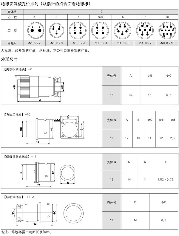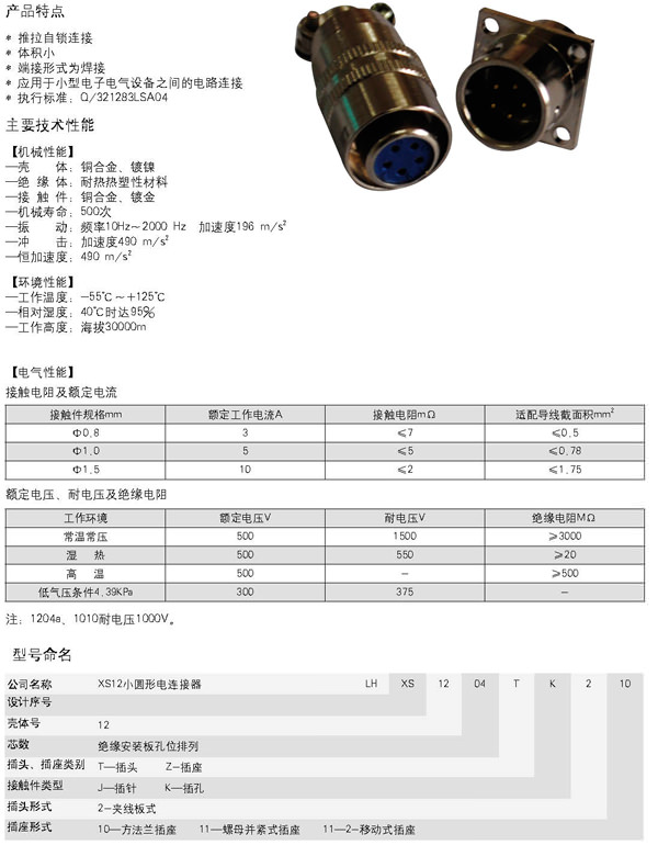 XS12小圓形電連接器主要適用于低壓信號 連接,采用直插自鎖結構,該產品具有體積小、快速分離的特點。主要技術性能環境性能 —工作溫度:-20℃~70℃ —相對濕度:40℃時達95% 機械性能—殼 體:銅合金、鍍鎳 —接 觸 件:銅合金、鍍金 —振動:頻率10Hz~2000 Hz加速度196m/s2—沖擊:加速度490m/s2 —絕緣體:熱塑性材料 —機械壽命:500次 電氣性能—接觸電阻及額定電流 電氣性能接觸電阻及額定電流